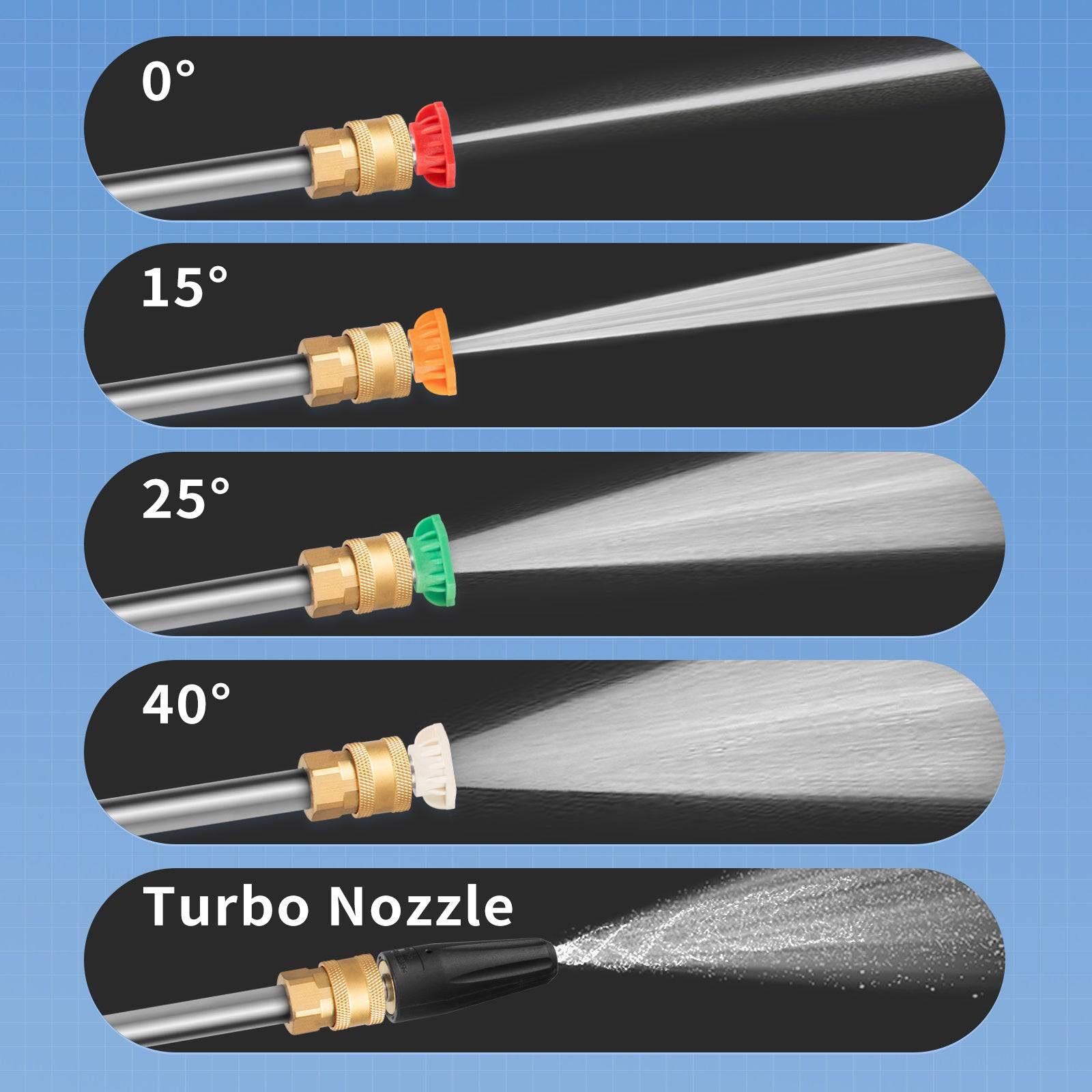 Best part of all, our power washer comes with 5 interchangeable nozzles of various sizes (0°, 15°, 25°, 40°, Turbo), making it useful for multiple scenarios and different cleaning tasks. At the same time, the extended long cable and big mobility wheels gives you the convenience to clean anywhere you want, including porches, patios, fences, decks, driveways, yards, RVs, and more!