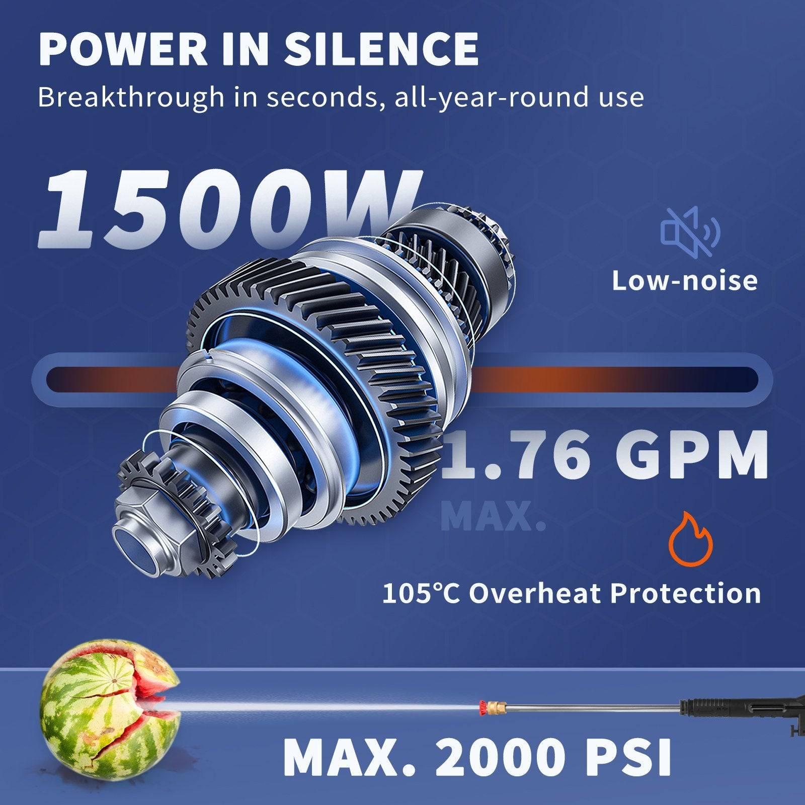 Unlike the typical electric pressure washer on the market, our electric power washer will provide you with unprecedented cleaning. It is built with a powerful 1500W motor that can generate MAX 2000PSI water pressure at MAX 1.76GPM water flow to clean up all old paint, oil, weed, and other stubborn stains.