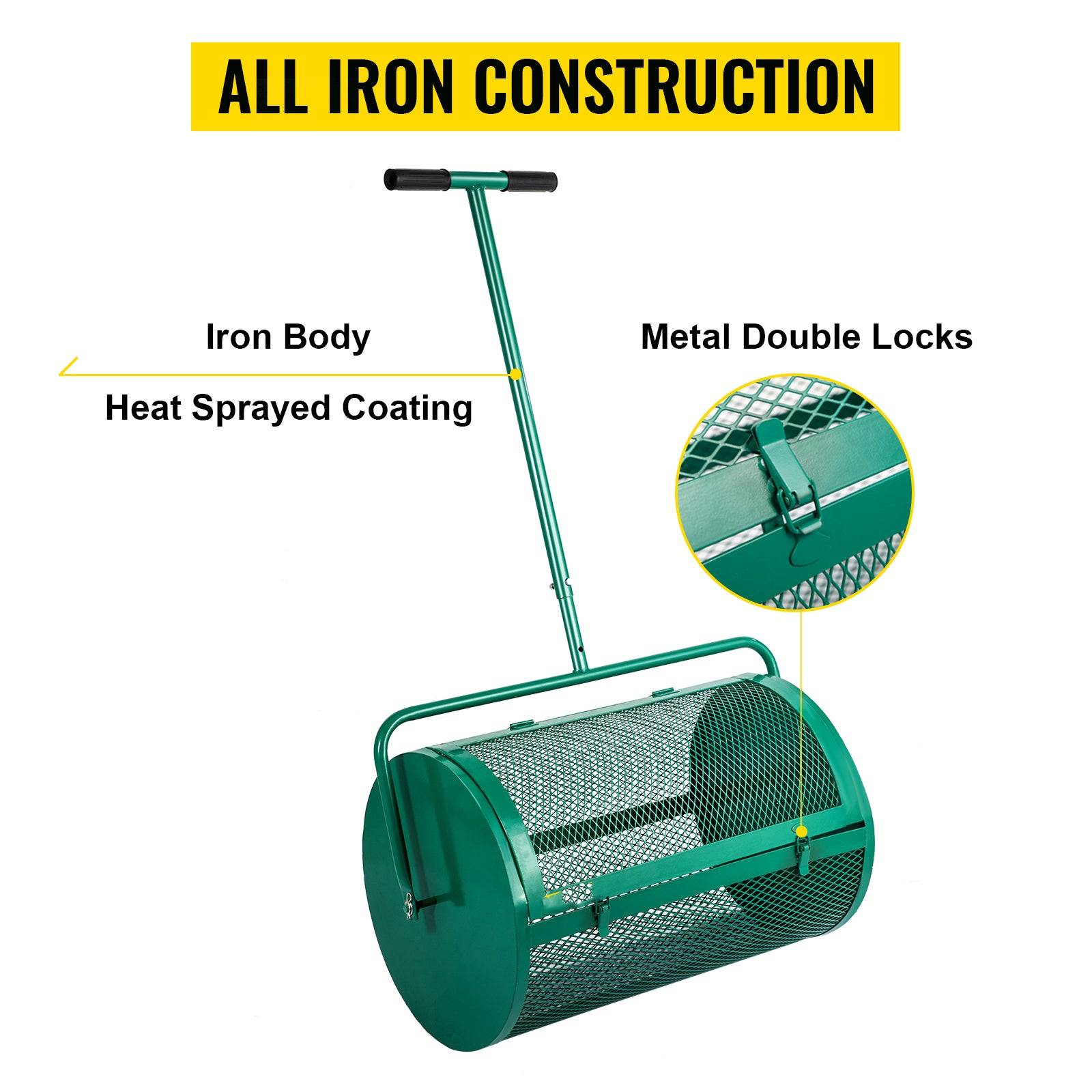 This sturdy iron barrel won't dent or deform easily. Our soil spreader's powder-coated finish ensures long-lasting service against all weathers, rust, and corrosion. Two flat locks are sturdy enough to stay closed while rolling to spread compost.